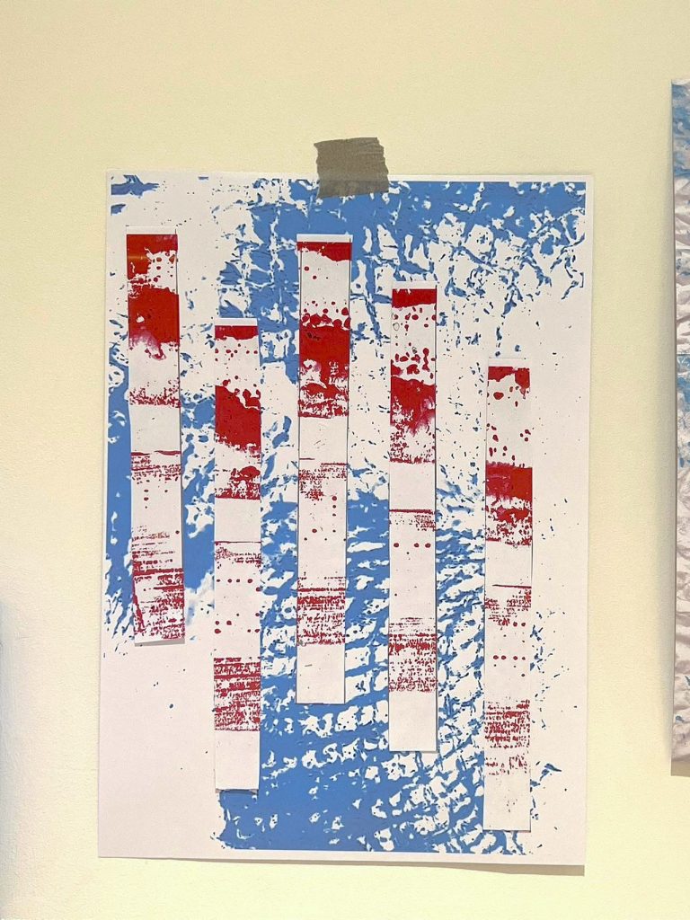 In the study of Mark Marking, I used recycled cardboard boxes and bubble wrap, dipped them in red and black paint, and printed them on both white paper and recycled cardboard. Following this, I scanned and enlarged the prints, altering colour saturation, combining the two through collaging.